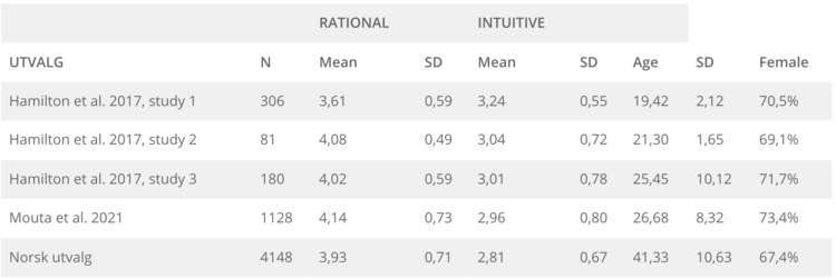 Som den viser er det noen vesentlige forskjeller i scorene mellom det norske og de amerikanske utvalgene til Hamilton. Hovedsaklig at de som har tatt den norske testen scorer noe lavere på den intuitive stilen og at spredningen er noe større større - standardavviket (SD) er høyere - for den rasjonelle stilen i det norske utvalgene.