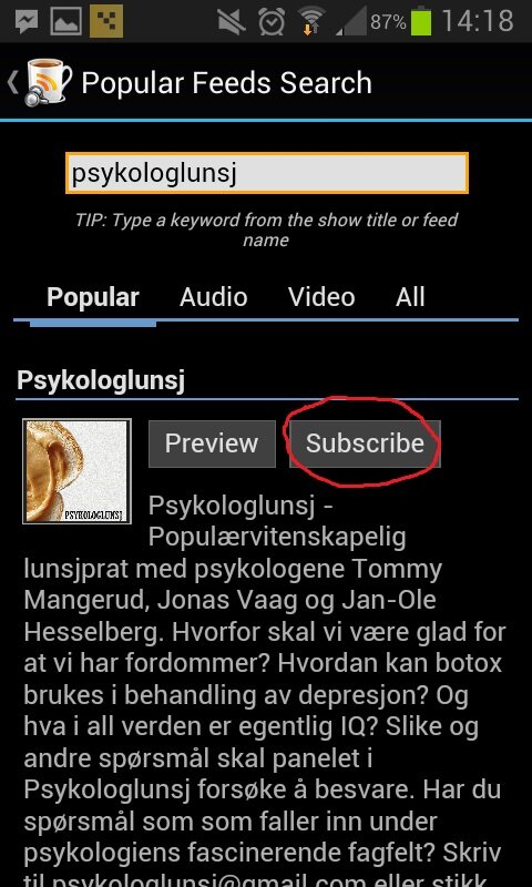 Lim eller skriv inn RSS-adressen ( http://www.psykologibloggen.no/?feed=podcast ) og trykk på søkesymbolet