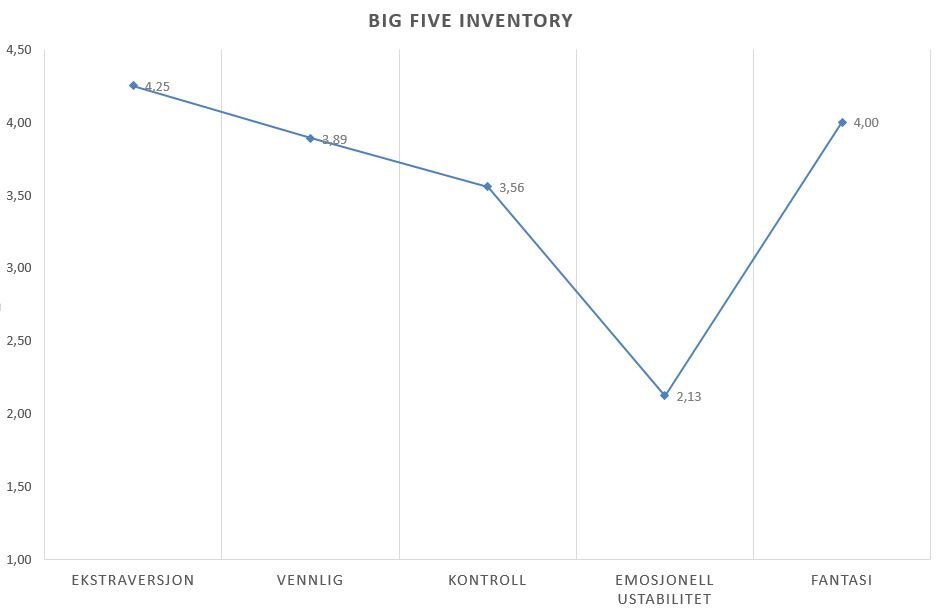 Har du lyst til å sjekke din egen profil på disse trekkene, kan du ta Big Five Inventory (BFI) her. Jeg tok selv denne testen i fjor og fikk følgende resultat: