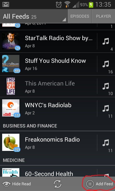Åpne BeyondPod og trykk på "Add feed" nede i høyre hjørne.
