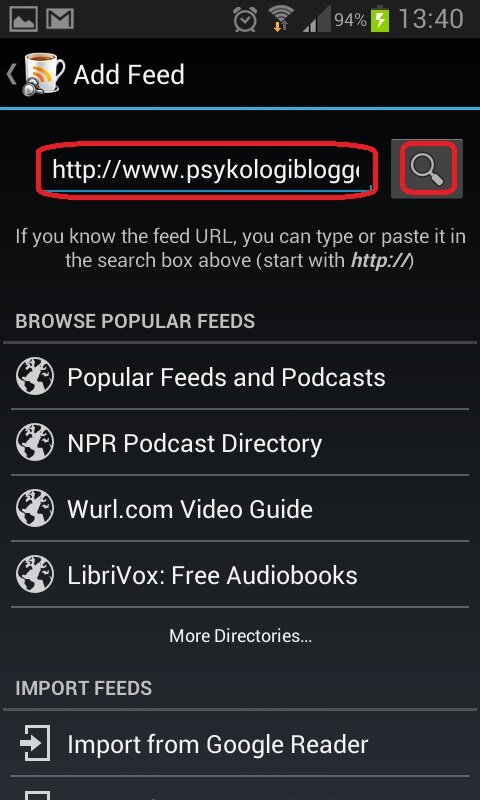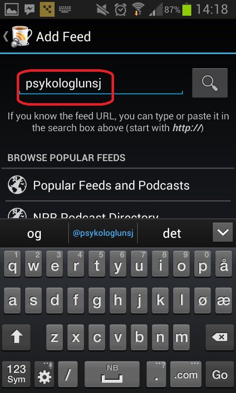 Lim eller skriv inn RSS-adressen ( http://www.psykologibloggen.no/?feed=podcast ) og trykk på søkesymbolet