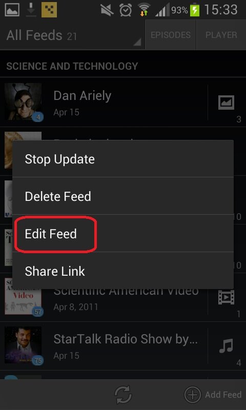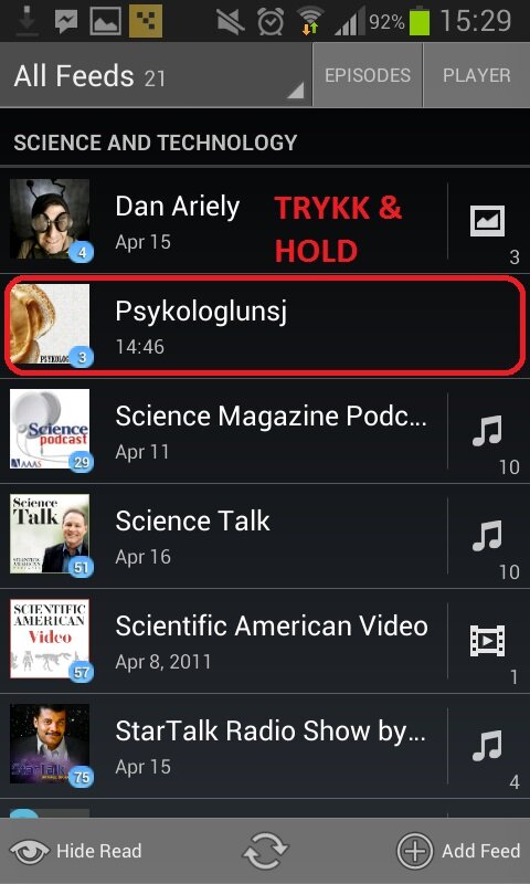 Du har gjort deg nesten ferdig, men du bør i tillegg sørge for at podcasten oppdateres regelmessig. Det gjør du veldig enkelt slik:Trykk og hold på podcasten.