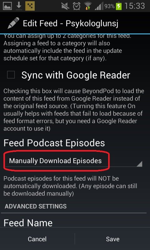 Gå/scroll nedover til du ser "Feed Podcast Episodes" og trykk deretter på området under og velg "Download Latest Episodes"